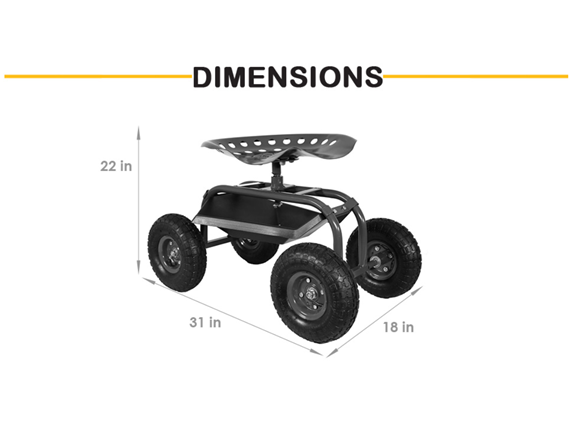 - COMFORTABLY TACKLE ANY TERRAIN: This rolling garden cart with seat has an overall size of 31" W x 18" D x 22" H and weighs 28 lbs. The seat measures 17.75" W x 15" D and has a 17.5" W x 15.25" D basket beneath. Plus, it features an adjustable height range from 16.5" to 22" H so it easy to find a comfortable height. The unit has an overall weight capacity of 300 lbs, and the wheels measure 10" in diameter.