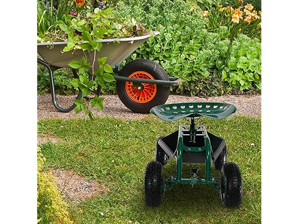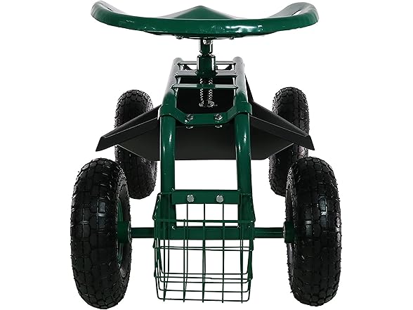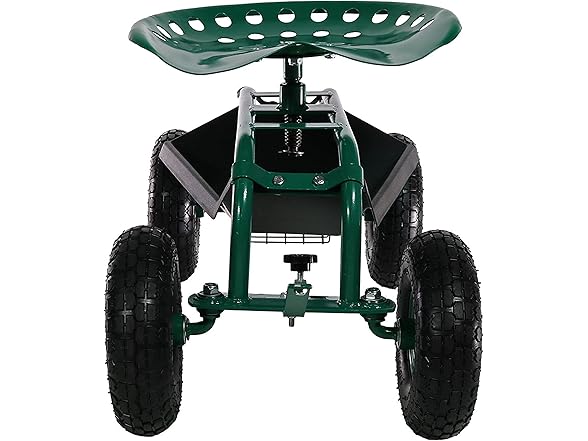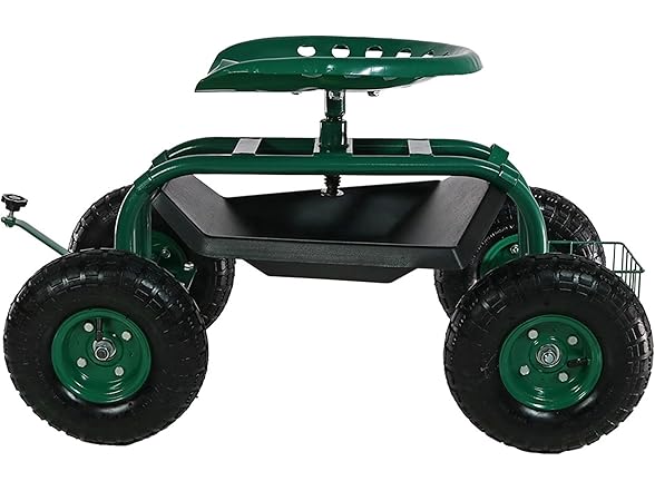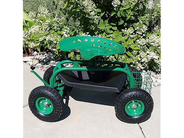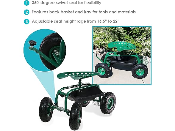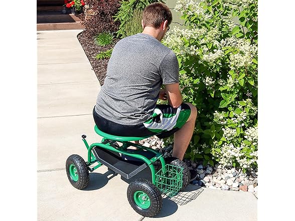 This garden stool for seniors is great for planting and gardening. Use this rolling garden seat while working in the yard to alleviate back strain or to take a well-deserved seat whenever needed. With a seat height range of 16.5 inches to 22 inches, a steel wire basket on the side for tools, and a black plastic tray underneath the seat, roll through any gardening or landscaping job with ease, comfort, and purpose! Use this gardening seat for work in the yard, lawn, farm, garage, shed, warehouse, or any other workspace where this garden scooter can thrive. Finish the landscaping jobs in half the time: this cart is made to last, boasting a heavy-duty, powder-coated steel frame and steering handle, as well as pneumatic tires. This rolling garden stool will resist the elements outdoors.