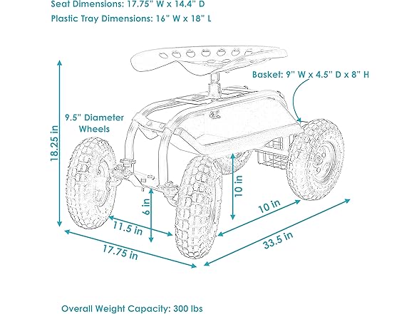 - COMFORTABLE SIZE: This garden cart on wheels with seat measures 33.5" W x 17.75" D x 18.25" H and weighs 29 lbs. It has a 300 lb weight capacity and the adjustable height seat ranges from 16.5" H to 22" H to easily find a comfortable height for working in the garden.