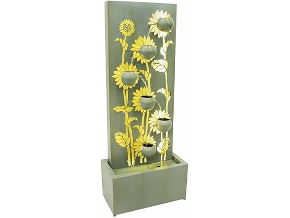 This versatile decorative garden fountain fosters tranquility in any indoor or outdoor space. Crafted from weather-resistant galvanized steel, it boasts enduring beauty with its green finish and gold accents. Display it proudly on a patio amidst the elements or introduce a touch of sophistication to an interior haven. This captivating focal point creates a mesmerizing display, transforming any environment. The complete kit ensures a hassle-free setup, featuring a submersible electric pump for continuous water flow and a warm white LED light strip to illuminate the cascading water, creating a calming ambiance after dark. The fountain's 48.5-inch height creates a lovely accent for any garden nook, adds serenity to a patio, deck, or balcony, or even transforms a relaxing indoor corner into a peaceful oasis. Let the gentle sounds of flowing water lull everyone into relaxation, transforming any space into a sanctuary for unwinding, inviting hours of peaceful enjoyment with the calming presence of nature's gentle rhythm.