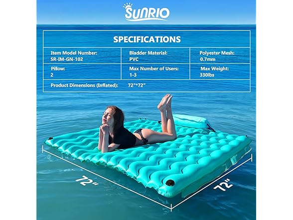 - Giant Floating Paridise: Sunrio 72''x72'' floating mat can be used on any open water, floating on the surface to let enough water in to keep you stay cool on the water and the warmth of the sun. Sunrio lake floats offers your family or friends to have activities, recreations, relaxation on the water.