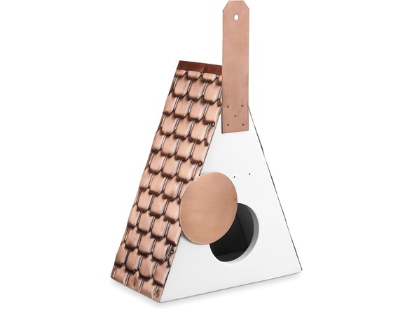 This unique creation is the ideal dwelling for songbirds. Designed with a durable structure, its sturdy body is masked by a beautiful face. The perch-less entry protects from nest-raiding paws, giving birds the freedom to enjoy this home. A generous 3” hole on back with sliding copper door makes clean-up a breeze. Air vents circulate fresh air through the space and drainage holes are in the base. Our pure copper roof adds character and taste to long-lasting mango hardwood – coated in white paint. Perch-less 1.25” entry with copper guard protects from predators. Dimensions: 13.5″ H x 8″ W x 5″ D (10”H without mount).