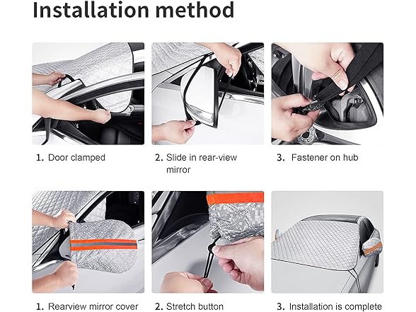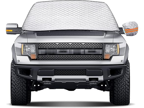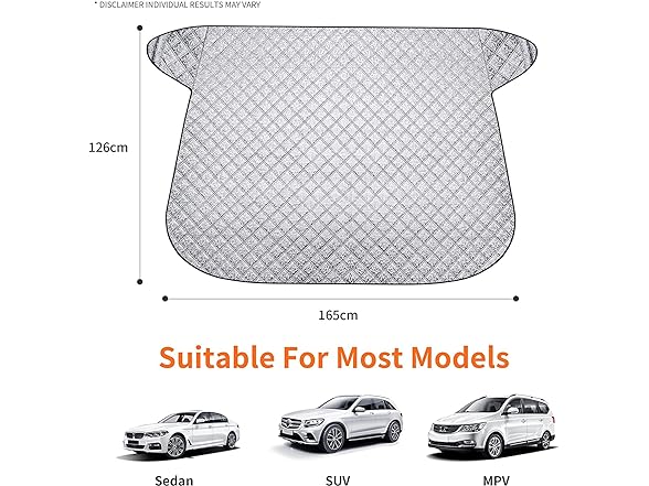 - Easy to Use: The windshield sun shade and snow cover has two small wings with which you can pinch it in the car door. Two side elastic straps on the wheels to secure the cover under windy conditions.