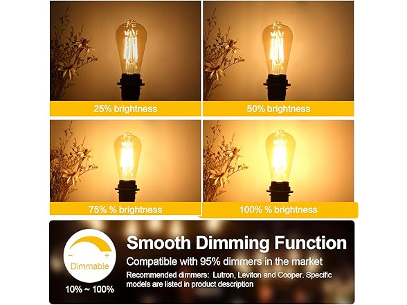 - Smoothly Dimmable Performance - Adopted advanced dimming technology, our vintage 100 watts incandescent equivalent amber LED bulbs are perfectly compatible with 90% dimmers in the market such as Lutron, Leviton (listed in the below product description), allowed you to dim the brightness from 0%- 100% stable at will, no flick, no strobe, customize your lighting and atmosphere now!