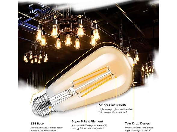 - Retro& Stylish Decorative Light Bulbs - Designed with squirrel cage filament, teardrop top and high-strength with shining brown finished glass, this retro look E26 vintage led bulb offers a nostalgic appearance for both indoor and outdoor even when turn off. Its standard e26 base ensure a versatile use in wall sconces, chandeliers, pendant lights or any light fixtures.