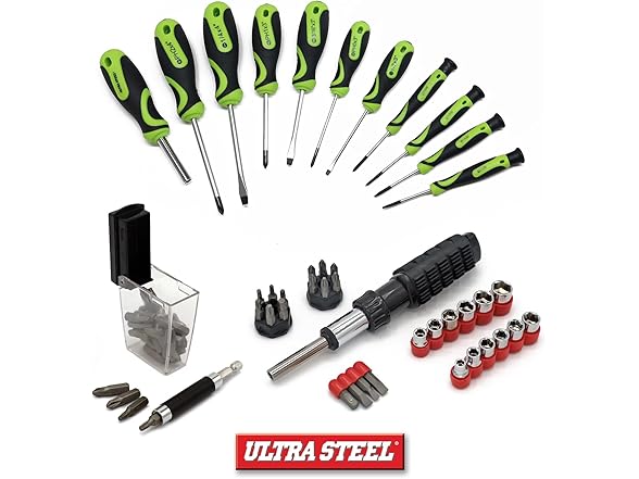 The ULTRA STEEL 60-piece tool set is your comprehensive solution for tackling fastening tasks with confidence and precision. This versatile collection brings together two essential kits: a 26-piece magnetic driver bit set and a 34-piece reversible ratchet screwdriver with carbon steel socket set. The magnetic driver bits include popular types like PH2, S1, S2, S3, and Star T20, ensuring you have the right bit for virtually any screw head you encounter. The socket set features both metric sizes from 5mm to 9mm and fractional sizes ranging from 1/4" to 1/2", providing flexibility for diverse projects. Crafted from durable carbon steel, these sockets deliver reliable strength and longevity, while the reversible ratchet mechanism allows for efficient operation in tight spaces. Whether you're assembling furniture, performing automotive maintenance, or handling general repairs around the home or workshop, this all-in-one tool set keeps you prepared. The organized storage ensures quick access to the right piece when you need it, making this kit an invaluable addition to any toolbox for both DIY enthusiasts and seasoned professionals.
