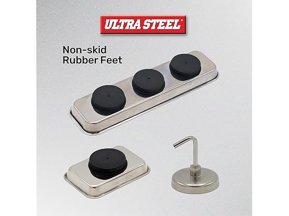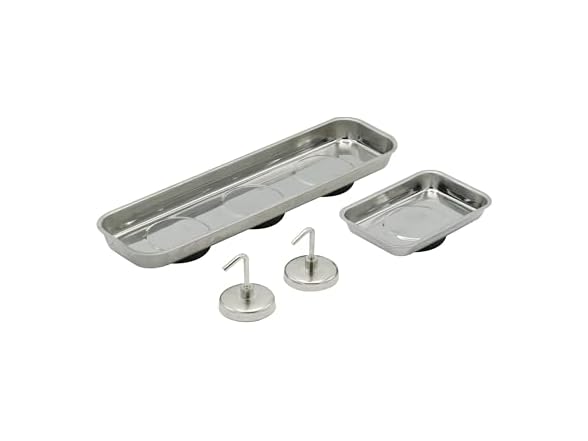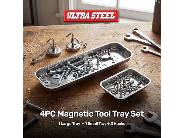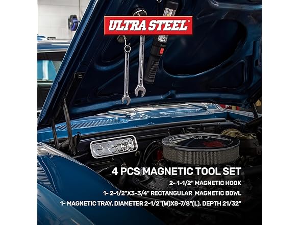 Keep your workspace organized and your tools within reach with the Ultra Steel 4-Piece Strong Magnetic Tool Tray and Hook Set. This comprehensive set is designed for car and general repair tasks, featuring powerful magnets that securely hold screws, bolts, and tools right where you need them. The set includes two 1-1/2 inch magnetic hooks perfect for hanging wrenches, pliers, and other hand tools, one rectangular magnetic bowl measuring 2-1/2 inches by 3-3/4 inches for collecting small fasteners, and one magnetic tray with dimensions of 2-1/2 inches wide by 8-7/8 inches long and 21/32 inches deep. Crafted from durable stainless steel, these magnetic organizers resist rust and corrosion while providing reliable holding power. Whether you're working under the hood, at your workbench, or tackling home repairs, this versatile set keeps hardware and tools secure and prevents the frustration of lost screws and bolts. The strong magnetic base adheres firmly to metal surfaces, making it ideal for automotive work, machinery repair, and general maintenance tasks.