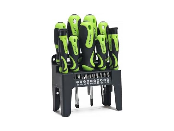 - COMPLETE 21-PIECE SET: Includes 6 full-size screwdrivers, 4 precision screwdrivers, 10 one-inch bits, 1 bit holder, and a convenient plastic storage rack for organized tool access