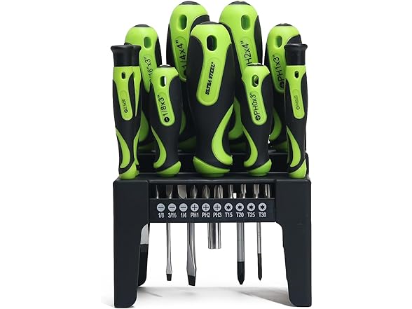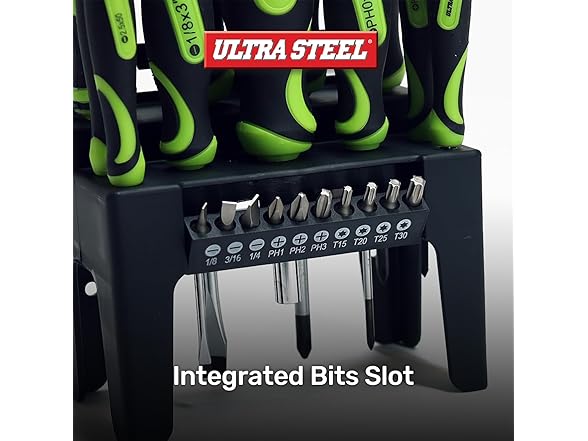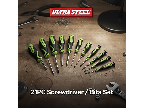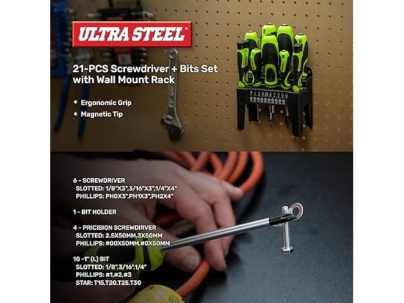 The ULTRA STEEL 21pc Screwdriver and Bit Set is a comprehensive tool collection designed to handle virtually any fastening task around your home, workshop, or job site. This versatile set includes 6 full-size screwdrivers featuring slotted sizes (1/8"x3", 3/16"x3", 1/4"x4") and Phillips sizes (PH0x3", PH1x3", PH2x4"), providing the reach and torque needed for standard applications. For delicate work on electronics and small devices, the set includes 4 precision screwdrivers with slotted (2.5x50mm, 3x50mm) and Phillips (#00x50mm, #0x50mm) options. The collection is rounded out with 10 one-inch bits in slotted (1/8", 3/16", 1/4"), Phillips (#1, #2, #3), and Star (T15, T20, T25, T30) configurations, plus a convenient bit holder for quick driver changes. Everything stores neatly in the included plastic storage rack, keeping your tools organized and easily accessible. Whether you're assembling furniture, performing repairs, or tackling DIY projects, this complete screwdriver set delivers the right tool for the job.