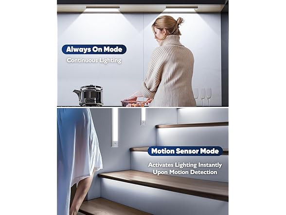 - Upgraded Two Operating Modes: Our 6500K LED under cabinet lights seamlessly switch between two operating modes: ①Always On Mode: Ensures illumination in any lighting environment.②Motion Sensor Mode: Automatically detects human activity and turns off when no activity is detected to reduce energy consumption. Additionally, it features a memory function that retains the last set brightness level, eliminating the need for resetting