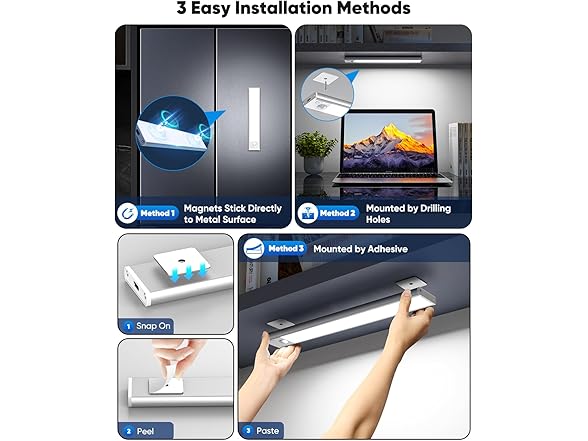 - 3 Easy Installation Methods: Our magnetic under cabinet lighting boasts a straightforward installation process, minimizing the time commitment required:①Magnetic Attachment: The built-in powerful magnets can adhere to ferromagnetic surfaces.②Adhesive Metal Plate: Use the accompanying metal adhesive plate to directly stick the light to the desired location.③Screw mounting: If you want to mount the cordless under cabinet light on the wall, you can securely install it using the provided screws and by drilling holes