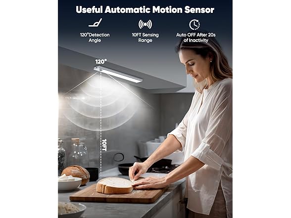 - Convenient Under Cabinet Motion Sensor Lighting: The Motion Sensor boasts detection angle of 120° and a sensing range of 10FT, ensuring comprehensive coverage of large areas and enhancing both ease of use and comfort. Additionally, the rechargeable under cabinet lights automatically switch off after 20 seconds of inactivity, promoting energy efficiency. By eliminating the need to search for switches in the dark, they offer significant convenience to you and your family