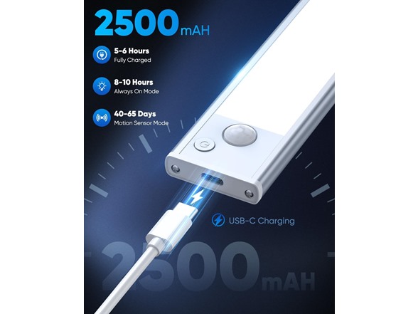 - Large 1500mAh (8"), 2200mAh (10"), 2200mAh (12") or 3200mAh (14") Battery: Our under cabinet lights, feature a built-in rechargeable battery, extending their working hours and reducing the need for frequent charging. When fully charged, these under counter lights can last for hours in Always On Mode with the brightness set to 100%