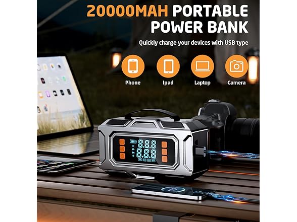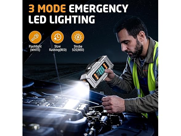 - Multifunctional Emergency Kit: This kit combines a car jumper starter portable, portable tire inflator, real-time tire pressure monitoring, and a 20000mAh high-capacity power bank with a USB-C interface for fast charging of mobile phones, tablets, or digital cameras. It also offers three lighting modes (flashlight, strobe, and SOS). It is essential for road travel, daily commuting, and unexpected emergencies to ensure that you will never be stranded in a place without electricity or lights.
