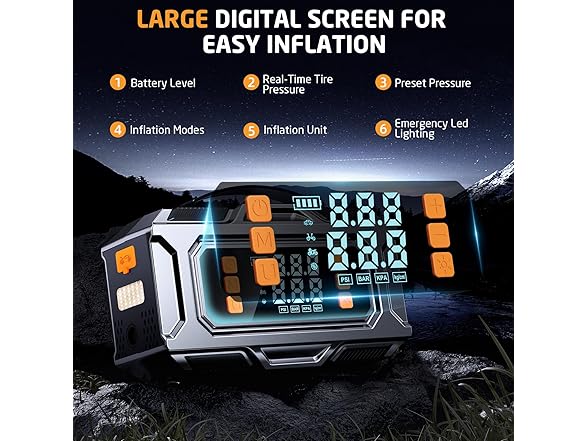 - Intelligent Wireless Inflation: This portable jump starter for car features an intuitive, large LCD screen for real-time tire pressure detection. At the same time, you can set the desired pressure, and when the pressure is reached, the machine will automatically shut down without the need for repeated adjustments and checks. The detachable extended hose provides additional extension distance for the valve stem, and the backlit screen remains perfectly readable even in the harshest sunlight without squinting or shielding.