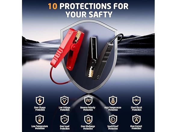 - 10 Safety Protection: This battery jumper starter portable features high-strength metal clips and smart jumper cables, providing 10 safety protections, including short circuits, overcurrent, reverse connection, overheating, overcharge, and overvoltage. It ensures optimal performance and long battery life, protecting car batteries from potential damage such as overheating, loose connections, and battery swelling. Indicator lights alert to potential operational errors, automatically detect connection problems, and provide real-time warnings.