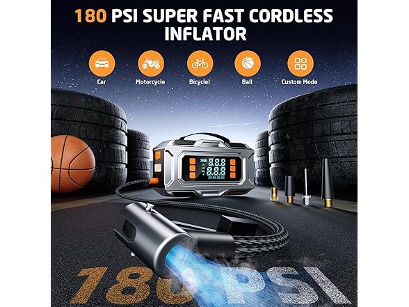 - Versatile Air Compressor: This jump starter with air compressor features real-time tire pressure detection and an automatic stop inflation function. It has four preset inflation modes (car, motorcycle, bicycle, ball), supports four selectable units (PSI, BAR, KPA, KG/cm²), and is equipped with four different nozzles. The jump starter can provide a maximum pressure of 180 PSI and an air flow rate of 35 L/min. It can inflate a standard 195/65 R15 car tire from 30 PSI to 36 PSI within one minute.