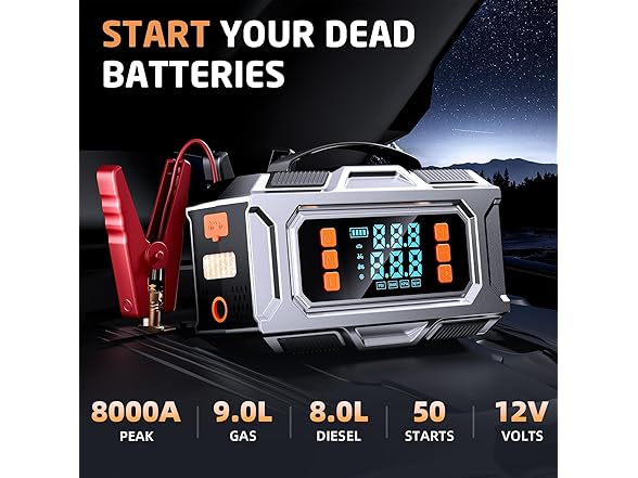 This car jump starter with air compressor is an all-around emergency assistant for vehicles. With a peak power of 8000A, it can start 9.0L gasoline / 8.0L diesel engines and various 12V vehicles within seconds. The intelligent automatic supercharging function takes effect in extreme environments ranging from -4°F to 140°F. It features professional air compression functionality, integrates real-time tire pressure detection and automatic shutdown design, offers four inflation modes and four units to choose from, and is equipped with four nozzles. With a maximum pressure of 180psi and a flow rate of 35L/min, it can complete the standard tire inflation in just one minute. In terms of safety, the high-strength metal clamp and smart jumper are combined with 10 layers of safety protection, and the indicator light provides a real-time alarm. As a jump box for car battery, it is also a 20,000mah power bank with three-mode lights. The LCD screen can display pressure in real time and customize preset values, allowing for clear operation even in strong light. The product weighs only 1.69 pounds and measures 4.29x2.48x7.63 inches. It is easy to store in a car or travel bag and comes in a complete set of accessories.