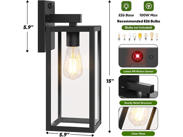 Upgraded Motion Sensor Outdoor Wall Light, Large Size Dusk to Dawn Porch Light Outdoor Wall Sconce Lantern, 3 Lighting Modes, Black