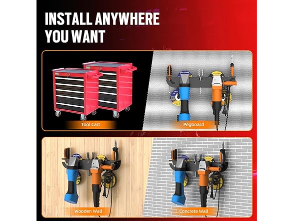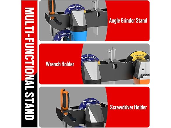 - SPACE SAVING - The angle grinder holder can be mounted on a tool box, cart, or wall, offering the ultimate in convenience, storage, and organization. It keeps your workspace organized, decluttered, and tidy while ensuring your tools are always within reach. No more worrying about accidentally knocking your grinder to the floor.