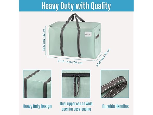 - Move Without Boxes – No need to buy and assemble packing boxes or look for moving supplies. Move easier with VENO sturdy and spacious moving bags that make a lightweight, convenient, and economical alternative to moving boxes. Just unfold, unzip, and begin loading as the dual tab zipper lid opens wide for easy packing and unloading. Take advantage of the versatility and use as a storage box, Christmas storage containers, laundry basket, and camping essentials bag. 27.6" W X 16.5" H X 13.8" D.