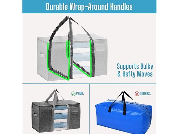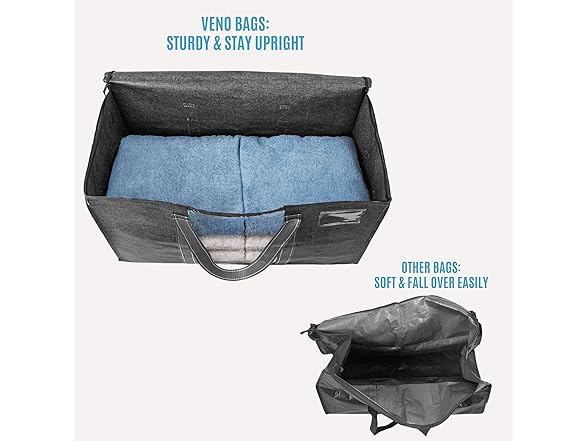 - Stands Upright for Easy Loading – No need to worry about your bag falling over while loading or unloading. VENO's large storage bags remain upright effortlessly, thanks to our sturdy and durable material. Experience the convenience of easy loading and unloading with the dual-tab zipper lid that opens wide, making moving and storing a breeze. Find stability and security with our versatile moving bags and storage solutions, perfect for clothes and various storage needs.