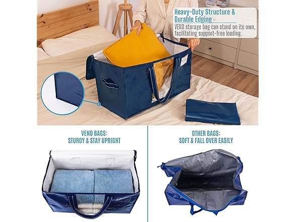 - Stands Upright for Easy Loading & Unloading – You don’t have to worry about your bag falling over while trying to load or unload. With a 2-way zipper top that opens wide, packing and unpacking become smoother than ever. VENO large storage bags stay upright for easy loading with our sturdy and durable PP Woven material that lasts a lifetime and makes moving, storing, and organizing a breeze, making them the perfect comforter, blanket, and bedding organizers.