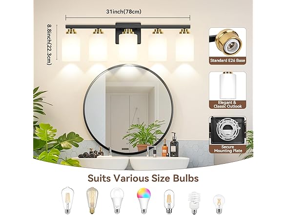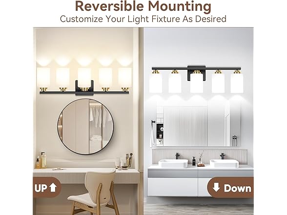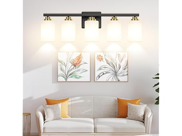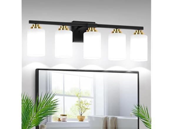 5-Light Bathroom Light Fixtures, 31" Modern Vanity Lights Over Mirror with Milky White Glass Shade, Black & Gold Light Fixture