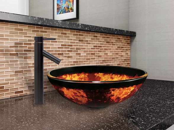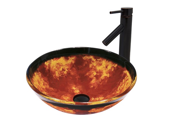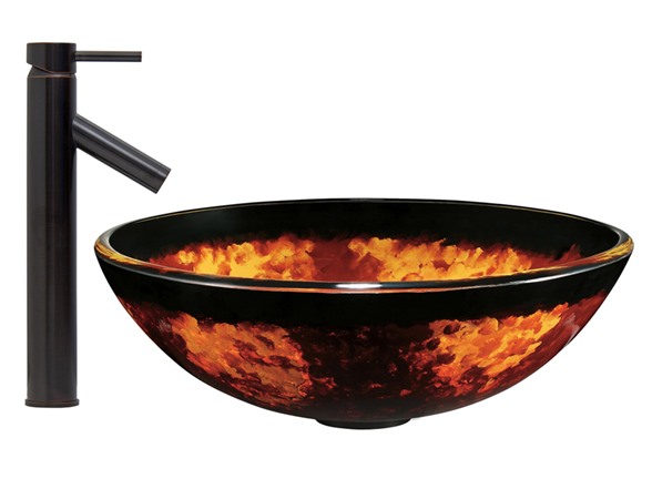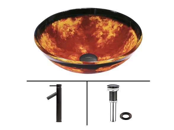 The VIGO Auburn/Mocha Fusion Glass Vessel Sink and Dior Faucet Set in Antique Rubbed Bronze Finish brings a unique and luxurious centerpiece to your bathroom. - The VG07005 Auburn/Mocha Fusion glass vessel sink features a perfect combination of brownish-red and gold tones topped with a rich shade of mocha. Handmade with possible unique and slight color variations, so no two sinks are identical Solid tempered glass construction Scratch-resistant interior glass Non-porous surface to prevent discoloration and fading Stain-resistant, easy-to-clean surface Polished glass interior with textured exterior Above-counter installation 1.75-in. standard drain opening - The VG03003ARB Dior vessel faucet in Antique Rubbed Bronze finish features a simple, single lever and mineral resistant aerator. Solid brass construction ensures durability and longer life VIGO finishes resist corrosion and tarnishing, exceeding industry durability standards Mineral-resistant aerator is easy-to-clean High-quality ceramic disc cartridge ensures maintenance free use Features easy single-hole installation Water pressure tested for industry standard 1.5 GPM flow rate All mounting hardware and hot/cold waterlines included Standard US plumbing .375-in. connections Includes solid brass pop-up drain and mounting ring, both in matching finish - Sink measurements: Diameter: 16.5-in. Height: 6-in. Thickness: .5-in. Faucet Measurements: Faucet height: 12.75-in. Spout height: 8-in. Spout reach: 4-in. Standard 1.375-in. diameter opening is required for this faucet - This VIGO vessel sink and faucet set is cUPC, NSF-61, AB1953, and WaterSense certified by IAPMO ADA Compliant