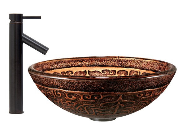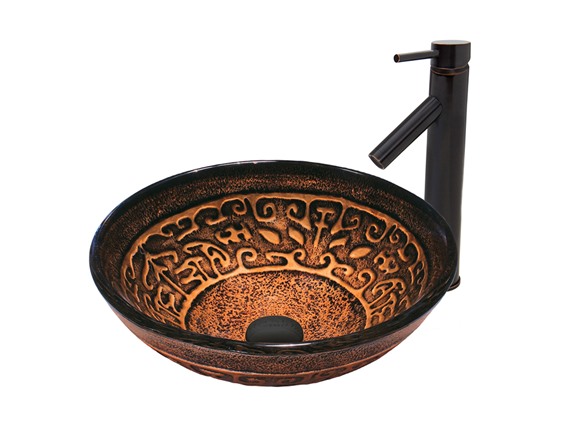 The VIGO Golden Greek glass vessel sink and Dior faucet set in antique rubbed bronze finish combines luxury with modern design. - The VG07019 Golden Greek glass vessel sink will remind you of an antique art piece, with its attractive and stylish dark brown color and golden design. Handmade with possible unique and slight color variations, so no two sinks are identical Solid tempered glass construction Scratch-resistant interior glass Non-porous surface to prevent discoloration and fading Stain-resistant, easy-to-clean surface Polished glass interior with textured exterior Above-counter installation 1.75-in. standard drain opening - The VG03003ARB Dior vessel faucet in antique rubbed bronze finish features a simple, single lever and mineral resistant aerator. Solid brass construction ensures durability and longer life VIGO finishes resist corrosion and tarnishing, exceeding industry durability standards Mineral-resistant aerator is easy-to-clean High-quality ceramic disc cartridge ensures maintenance free use Features easy single-hole installation Water pressure tested for industry standard 1.5 GPM flow rate All mounting hardware and hot/cold waterlines included Standard US plumbing .375-in. connections Includes solid brass pop-up drain and mounting ring, both in matching finish - Sink measurements: Diameter: 16.5-in. Height: 6-in. Glass thickness: .625-in. Faucet Measurements: Faucet height: 12.75-in. Spout height: 8-in. Spout reach: 4-in. Standard 1.375-in. diameter opening is required for this faucet - This VIGO vessel sink and faucet set is cUPC, NSF-61, AB1953, and WaterSense certified by IAPMO ADA Compliant