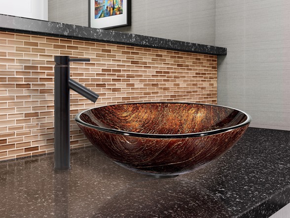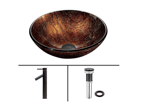 The VIGO Kenyan Twilight Glass Vessel Sink and Dior Faucet Set in Antique Rubbed Bronze Finish combines warm colors and tones with mature sophistication. - The VG07029 Kenyan Twilight glass vessel sink captures the mesmerizing glimmer of twilight with its warm brown and golden tones. Handmade with possible unique and slight color variations, so no two sinks are identical Solid tempered glass construction Scratch-resistant interior glass Non-porous surface to prevent discoloration and fading Stain-resistant, easy-to-clean surface Polished glass interior with textured exterior Above-counter installation 1.75-in. standard drain opening - The VG03003ARB Dior vessel faucet in Antique Rubbed Bronze finish features a simple, single lever and mineral resistant aerator. Solid brass construction ensures durability and longer life VIGO finishes resist corrosion and tarnishing, exceeding industry durability standards Mineral-resistant aerator is easy-to-clean High-quality ceramic disc cartridge ensures maintenance free use Features easy single-hole installation Water pressure tested for industry standard 1.5 GPM flow rate All mounting hardware and hot/cold waterlines included Standard US plumbing .375-in. connections Includes solid brass pop-up drain and mounting ring, both in matching finish - Sink measurements: Diameter: 16.5-in. Height: 6-in. Glass thickness: .5-in. Faucet Measurements: Faucet height: 12.75-in. Spout height: 8-in. Spout reach: 4-in. Standard 1.375-in. diameter opening is required for this faucet - This VIGO vessel sink and faucet set is cUPC, NSF-61, AB1953, and WaterSense certified by IAPMO ADA Compliant