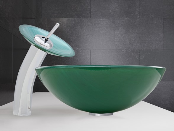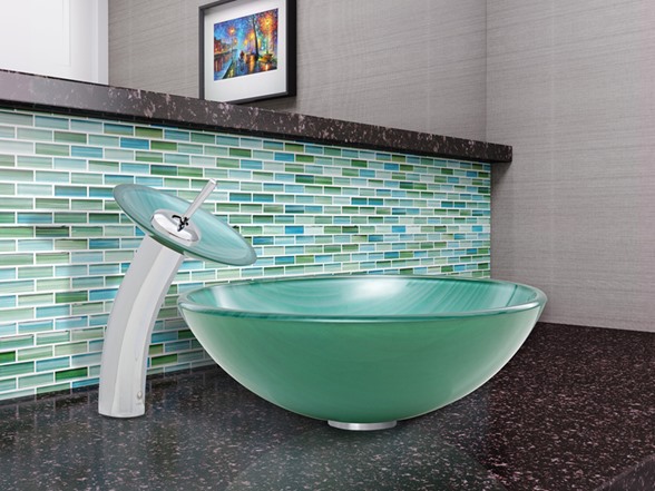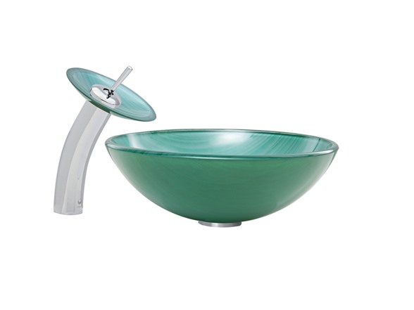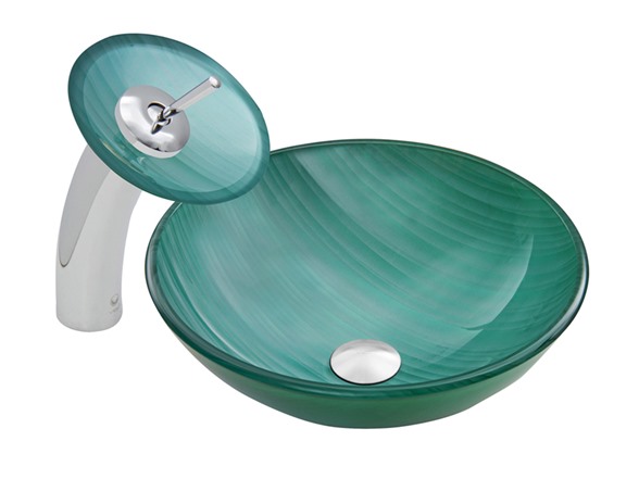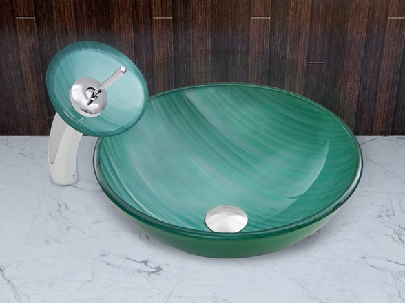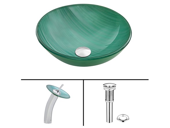 The VIGO Whispering Wind Glass Vessel Sink and Waterfall Faucet Set in a Chrome Finish will blow a sense of modern design into your bathroom. - The VG07066 Whispering Wind glass vessel sink features a greenish-blue hue and wisps of white, bringing a breath of fresh air to your bathroom. Handmade with possible unique and slight color variations, so no two sinks are identical Solid tempered glass construction Scratch-resistant interior glass Non-porous surface prevents discoloration and fading Stain-resistant, easy-to-clean surface Polished glass interior with textured exterior Above-counter installation 1.75-in. standard drain opening - The VG03002CH056 waterfall faucet features a Chrome finish with matching Whispering Wind glass disc Solid brass construction ensures durability and longer life VIGO finishes resist corrosion and tarnishing, exceeding industry durability standards High-quality ceramic disc cartridge ensures maintenance-free use Easy single-hole faucet installation Water pressure tested for industry standard 1.5 GPM flow rate All mounting hardware and hot/cold waterlines included Standard US plumbing .375-in. connections Includes solid brass pop-up drain and mounting ring, both in matching finish. - Sink measurements: Diameter: 16.5-in. Height: 5.5-in. Glass thickness:.5-in. Faucet measurements: Overall Height: 11.5-in. Spout Height: 7.25-in. Spout Reach: 6.125-in. Overall Diameter: 7.125-in. Standard 1.375-in. diameter opening is required for this faucet - This VIGO glass vessel sink and waterfall faucet set is cUPC, NSF-61, AB1953, and WaterSense certified by IAPMO ADA Compliant