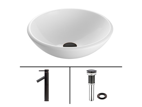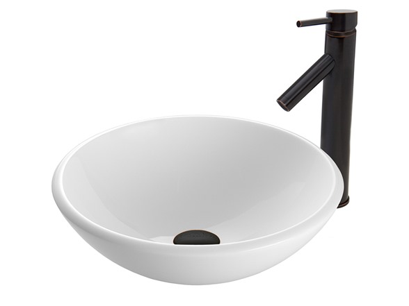 The VIGO White Phoenix Stone Vessel Sink and Dior Faucet Set in Antique Rubbed Bronze Finish creates the perfect combination of style, elegance, and design for your bathroom. - The VG07039 White Phoenix Stone vessel sink features a clean, spotless white color, with a smooth rounded edge combining the durability and natural aesthetics of granite, marble, ceramic and glass. Phoenix Stone is a revolutionary new blend of crystallized and stone resulting in a highly durable complex material Scratch-resistant Non-porous surface prevents discoloration and fading Stain resistant, easy-to-clean surface Polished interior with matte exterior Above-counter installation 1.75-in. standard drain opening - The VG03003ARB Dior vessel faucet in Antique Rubbed Bronze finish features a simple, single lever and mineral resistant aerator. Solid brass construction ensures durability and longer life VIGO finishes resist corrosion and tarnishing, exceeding industry durability standards Mineral-resistant aerator is easy-to-clean High-quality ceramic disc cartridge ensures maintenance free use Features easy single-hole installation Water pressure tested for industry standard 1.5 GPM flow rate All mounting hardware and hot/cold waterlines included Standard US plumbing .375-in. connections Includes solid brass pop-up drain and mounting ring, both in matching finish - Sink measurements: Diameter: 15.5-in. Height: 5.5-in. thickness: .625-in. Faucet Measurements: Faucet height: 12.75-in. Spout height: 8-in. Spout reach: 4-in. Standard 1.375-in. diameter opening is required for this faucet - This VIGO vessel sink and faucet set is cUPC, NSF-61, AB1953, and WaterSense certified by IAPMO ADA Compliant