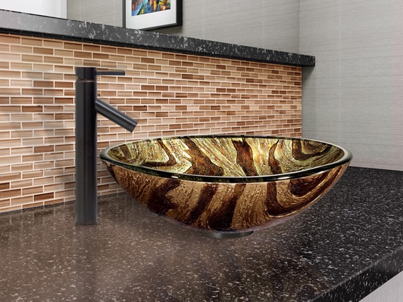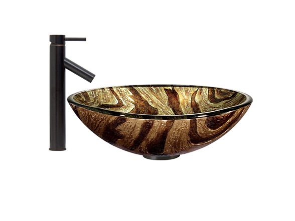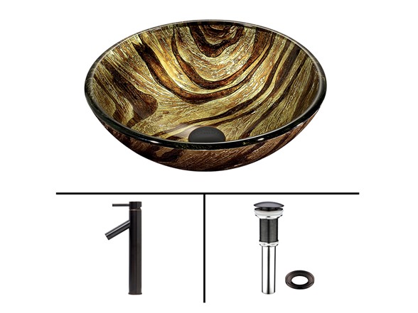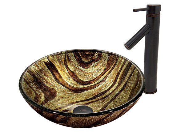 The VIGO Zebra Glass Vessel Sink and Dior Faucet Set in Antique Rubbed Bronze Finish will make your new bathroom the most stylish room in your house. - The VG07034 Zebra glass vessel sink features a neutral golden sand color with rich brown stripes and swirls. Handmade with possible unique and slight color variations, so no two sinks are identical Solid tempered glass construction Scratch-resistant interior glass Non-porous surface to prevent discoloration and fading Stain-resistant, easy-to-clean surface Polished glass interior with textured exterior Above-counter installation 1.75-in. standard drain opening - The VG03003ARB Dior vessel faucet in Antique Rubbed Bronze finish features a simple, single lever and mineral resistant aerator. Solid brass construction ensures durability and longer life VIGO finishes resist corrosion and tarnishing, exceeding industry durability standards Mineral-resistant aerator is easy-to-clean High-quality ceramic disc cartridge ensures maintenance free use Features easy single-hole installation Water pressure tested for industry standard 1.5 GPM flow rate All mounting hardware and hot/cold waterlines included Standard US plumbing .375-in. connections Includes solid brass pop-up drain and mounting ring, both in matching finish - Sink measurements: Diameter: 16.5-in. Height: 6-in. Glass thickness: .625-in. Faucet Measurements: Faucet height: 12.75-in. Spout height: 8-in. Spout reach: 4-in. Standard 1.375-in. diameter opening is required for this faucet - This VIGO vessel sink and faucet set is cUPC, NSF-61, AB1953, and WaterSense certified by IAPMO ADA Compliant