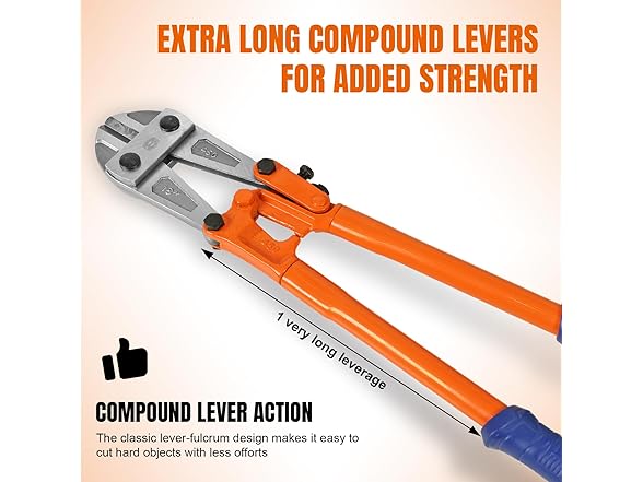 - LEVERAGED DESIGN: The extended multi-stage lever design and precisely aligned blades provide greater leverage with less force, amplifying the force acting on the handles and transferring it to the jaws and cutting blades to cut through tough objects with ease.