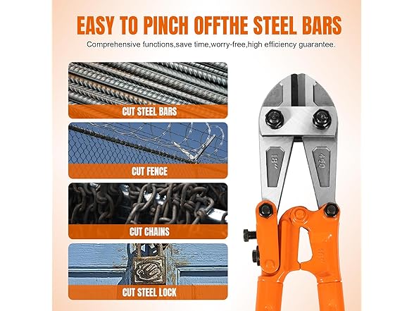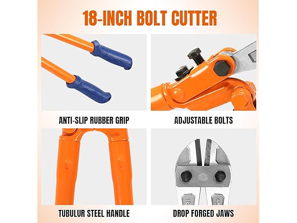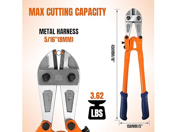 - SIZE AND CUT RANGE: With a size of 18 Inch (450mm), these bolt cutters offer an optimal balance between maneuverability and cutting capacity HRC≤42: 1/4-inch(6mm Maximum);HRC<25: 5/16-inch(8mm Maximum)