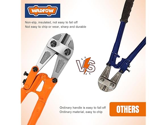 WADFOW heavy-duty medium size bolt cutter 18" for cutting fence, manufactured from high quality chrome vanadium steel, forged in one piece, with high wear resistance and toughness to prevent breakage and increase tool life. The cutting edge is multi-hardened for high hardness and excellent cutting performance without deformation. To ensure that the product is delivered in the best possible condition, we add a layer of anti-rust oil to the surface of the product, which should not be wiped. The handle has been designed with comfort and non-slip in mind, providing a secure grip for crisper cuts and reduced hand fatigue during prolonged use. The extended multi-stage lever design and precisely aligned blades provide greater leverage with less effort, amplifying the force applied to the handles and transferring it to the jaws and blades to cut through tough materials with ease. Cutting capacity medium metal Rockwell hardness ≤36: 1/5 in (5mm): soft metal Rockwell hardness ≤25: 15/64 in (6mm), making it perfect for cutting bolts, chains and other metals.