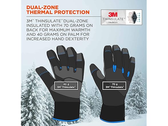- THERMAL PROTECTION – Dual-zone insulated with 40 grams (palm) and 70 grams (back of hand) 3M Thinsulate for extreme hand protection in cold conditions.