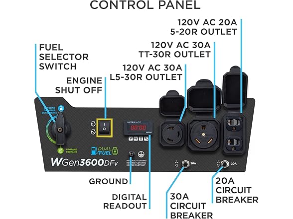 - Features One 5-20R 120V Household Duplex Receptacle, One RV-Ready TT-30R 30 Amp Receptacle, and One L5-30R 30 Amp Receptacle; All Outlets Have Rubber Covers for Added Safety