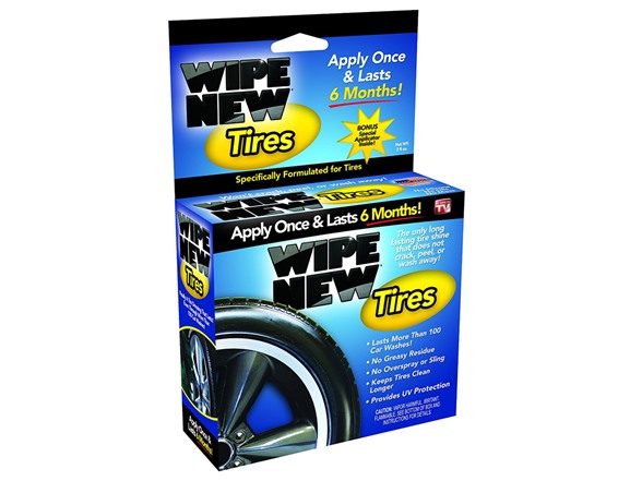 Now keep your tires as showroom new as your car with Wipe New Tires! Neither snow nor rain nor heat nor gloom of dozens of car washes will stop Wipe New Tires from keeping your tires better than new for a full six months! It's not only the best protection your tires ever had - it's the fastest! Just wipe it on and let it dry. Your tires will be protected from snow, slush and road chemicals all season long and into the summer! Get protection from mud and muck, heat and sand along with all the normal dust and road grime. It all just rinses right off! Car enthusiasts and professional detailers alike wouldn't pamper their expensive tire investments with anything else. Ordinary tire products are just surface coatings and don't last. When they're exposed to water, they basically wash right off. Wipe New Tires applies quickly and evenly with our special applicator. You'll get that newer-than-new look through a hundred car washes. Wipe New Tires is not a coating, it's a proprietary formula that bonds to your tires, filling the pores and protecting deeper and more effectively than any other tire product. Stop wasting time re-applying other products week after week for a shine that lasts a few days at best. Wipe New Tires is the world's longest lasting tire shine. Our revolutionary formula will keep your tires looking better than new through all conditions for 6 months after only one application.