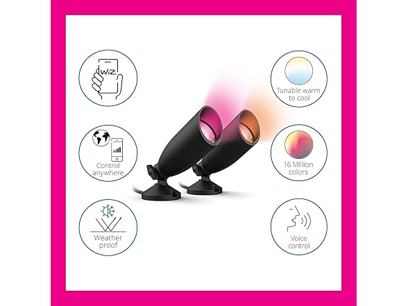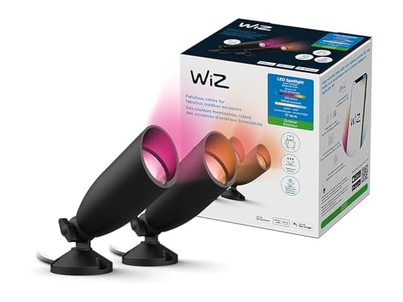 In the Box: (1) WiZ Connected LED Color Changing Outdoor Spotlight- Starter Kit - Weatherproof - Control with WiZ App - Works with Google Home, Alexa, and Siri Shortcuts - 2 Pack