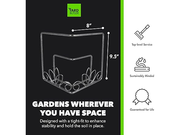 - GREAT DIMENSION & STABILITY: Yard Butler IGC-1 Garden Corners are engineered with a tight fit to ensure stability, retain soil, and reduce water waste. It measures 8" wide x 8" deep x 9.5" tall, and each corner or bracket weighs only 2 lbs.—making organizing your outdoor gardening project simple and effective!