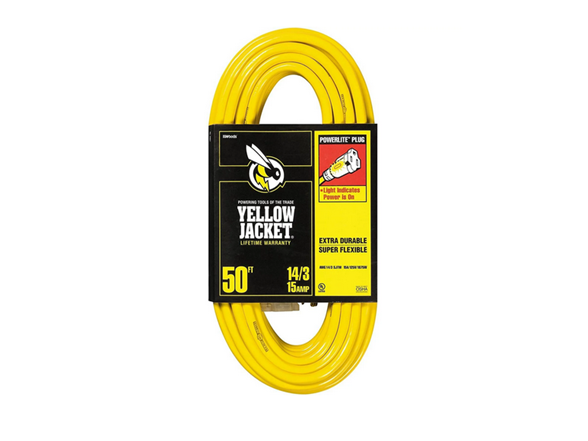 In the box: (1) YELLOW JACKET 50 ft. 14/3 SJTW Outdoor Heavy-Duty 15 Amp Contractor Extension Cord with Power Light Plug