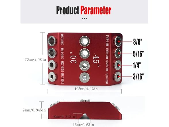 - 3.Multi-size Guide Holes: Each drilling angle is paired with four guide hole sizes: 3/8”(9.52mm), 5/16”(7.93mm), 1/4”(6.35mm), and 3/16"(4.76mm). These are compatible with most cable railing protector sleeves and lag screws, creating a highly efficient and portable angled drill guide.